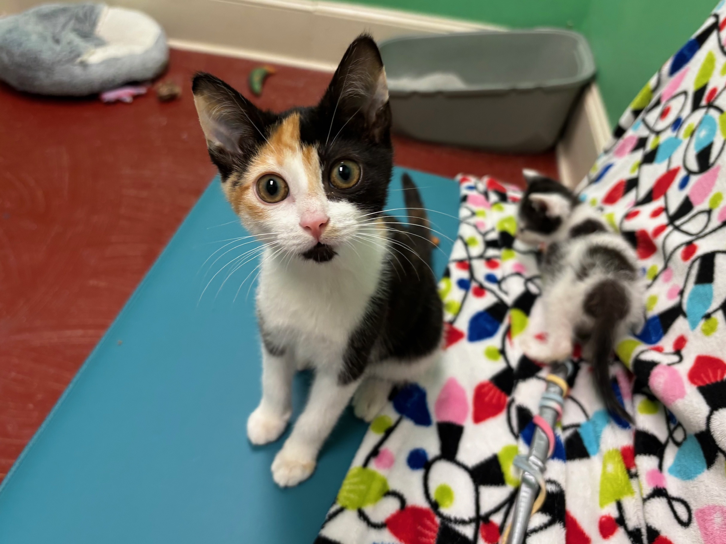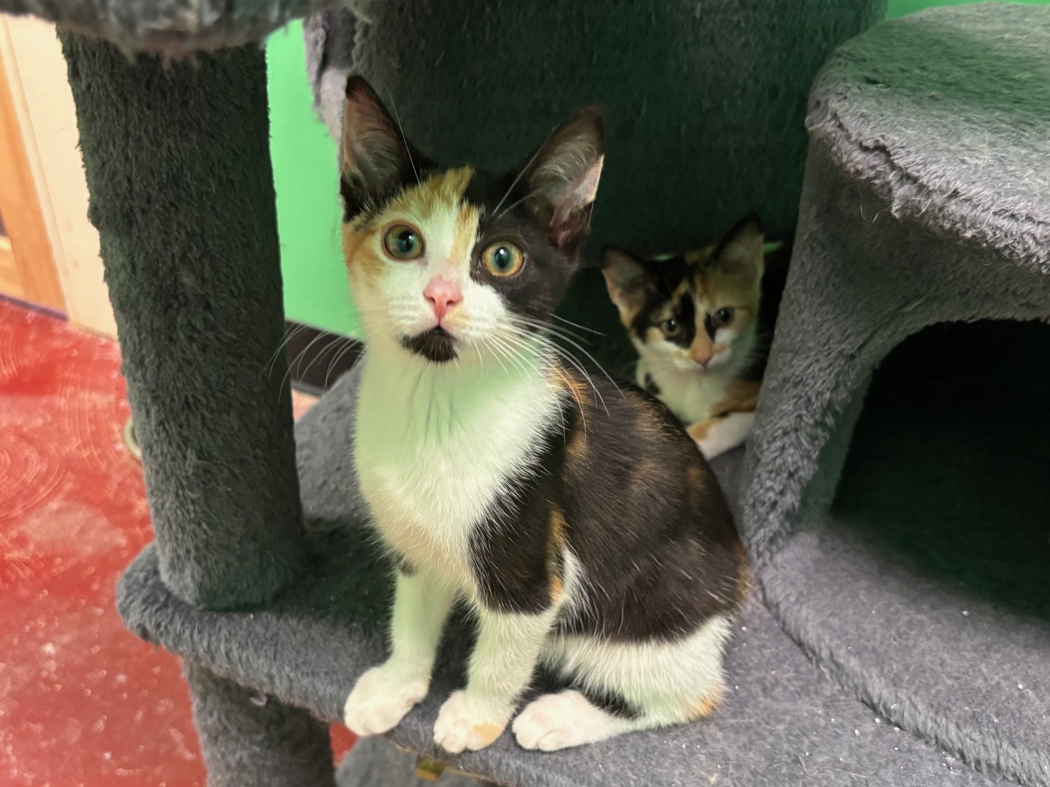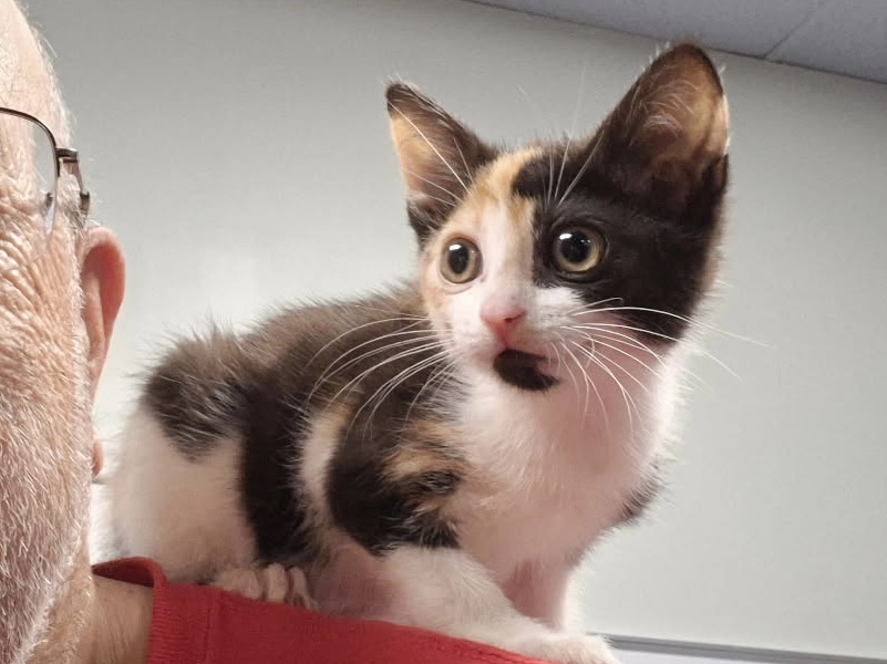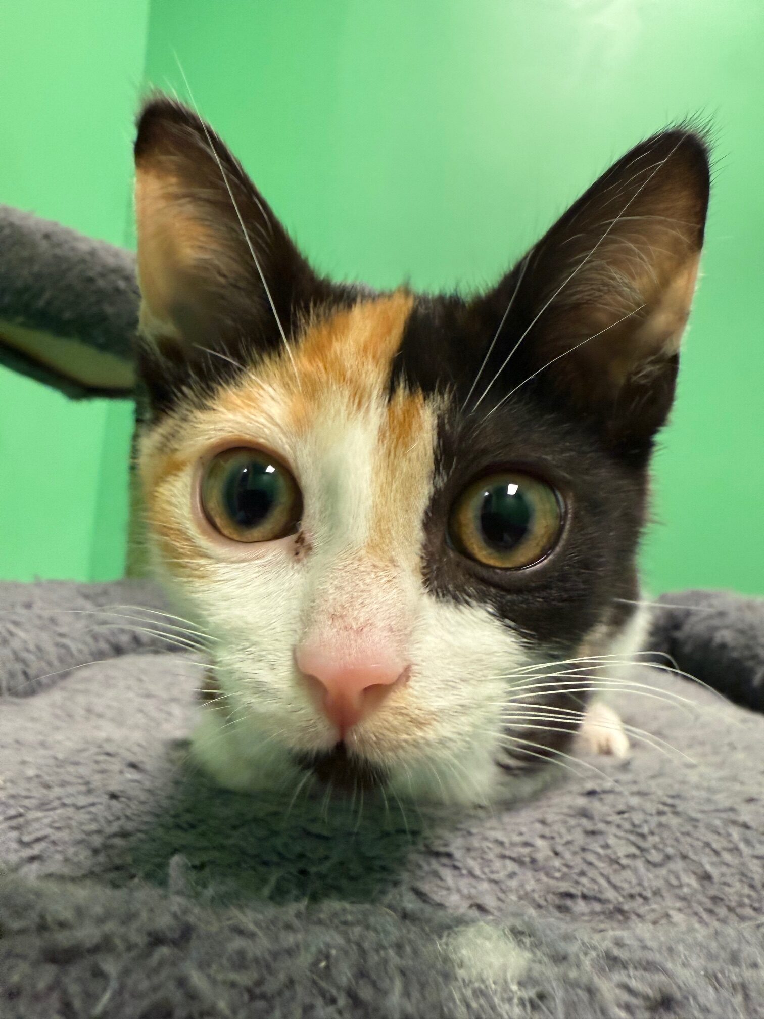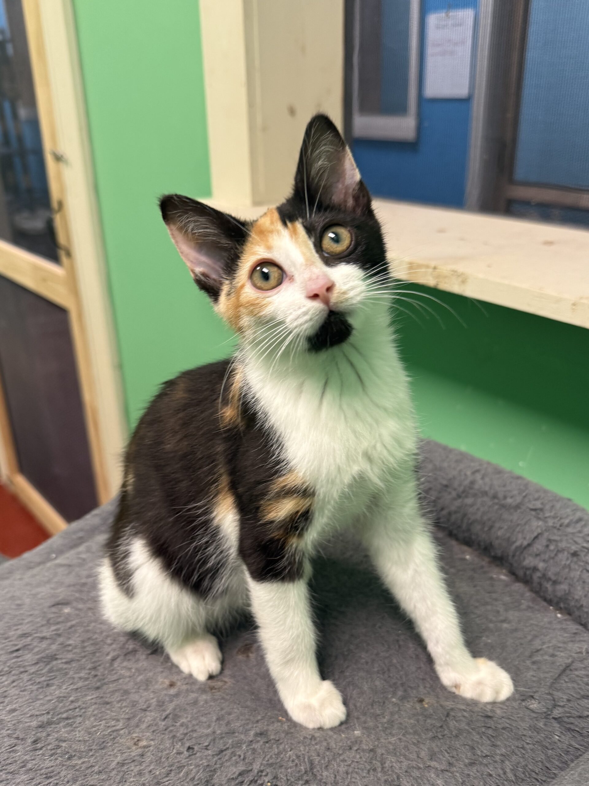 Fig is an adorable calico kitten. Born in May 2025, Fig was captured during a local TNR effort and was soon found not to be feral. She is an adventurous and playful kitten who has no fear and loves meeting new people. If she’s not chasing the feather wand, she’s purring in your lap. She loves to play with her brother and sister, Blueberry and Apple, and would love a home with one of her siblings or another young cat.