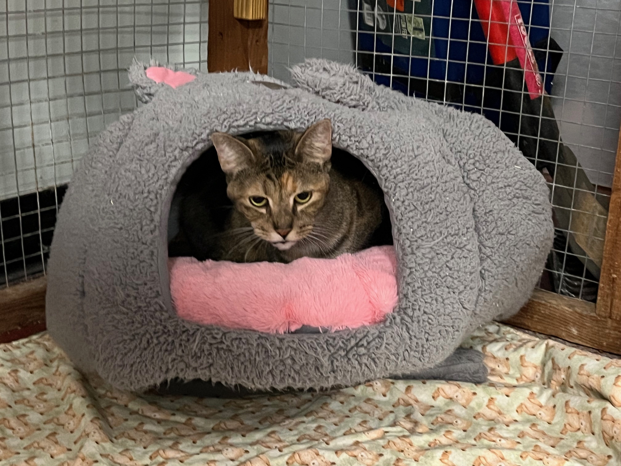 Georgia is an affectionate nine-year-old “torbie” (tortoiseshell + tabby). She’s a laidback gal who is happiest when she’s lounging in your lap and getting chin scratches. Georgia is FIV+ (Feline Immunodeficiency Virus), but she doesn’t let that slow her down. Cats that are FIV+ can live as long and as healthily as FIV- cats, and FIV is not contagious to dogs or humans. She could also live in a home with another gentle cat.