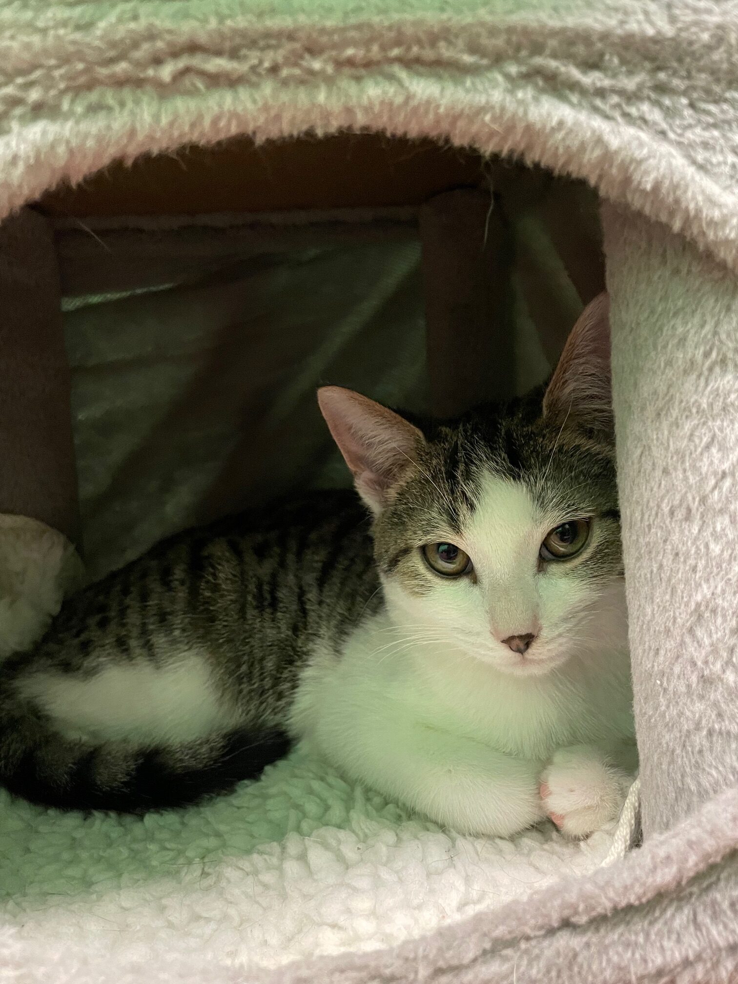 Pepper was captured during a local TNR effort and was soon found not to be feral. He is a handsome tabby with captivating green eyes. Born in November 2024, Pepper is a playful and affectionate kitty who thrives on love and attention. While he is initially shy around new people, he quickly warms up to those who show him patience and kindness, making him a perfect match for a calm and caring family.