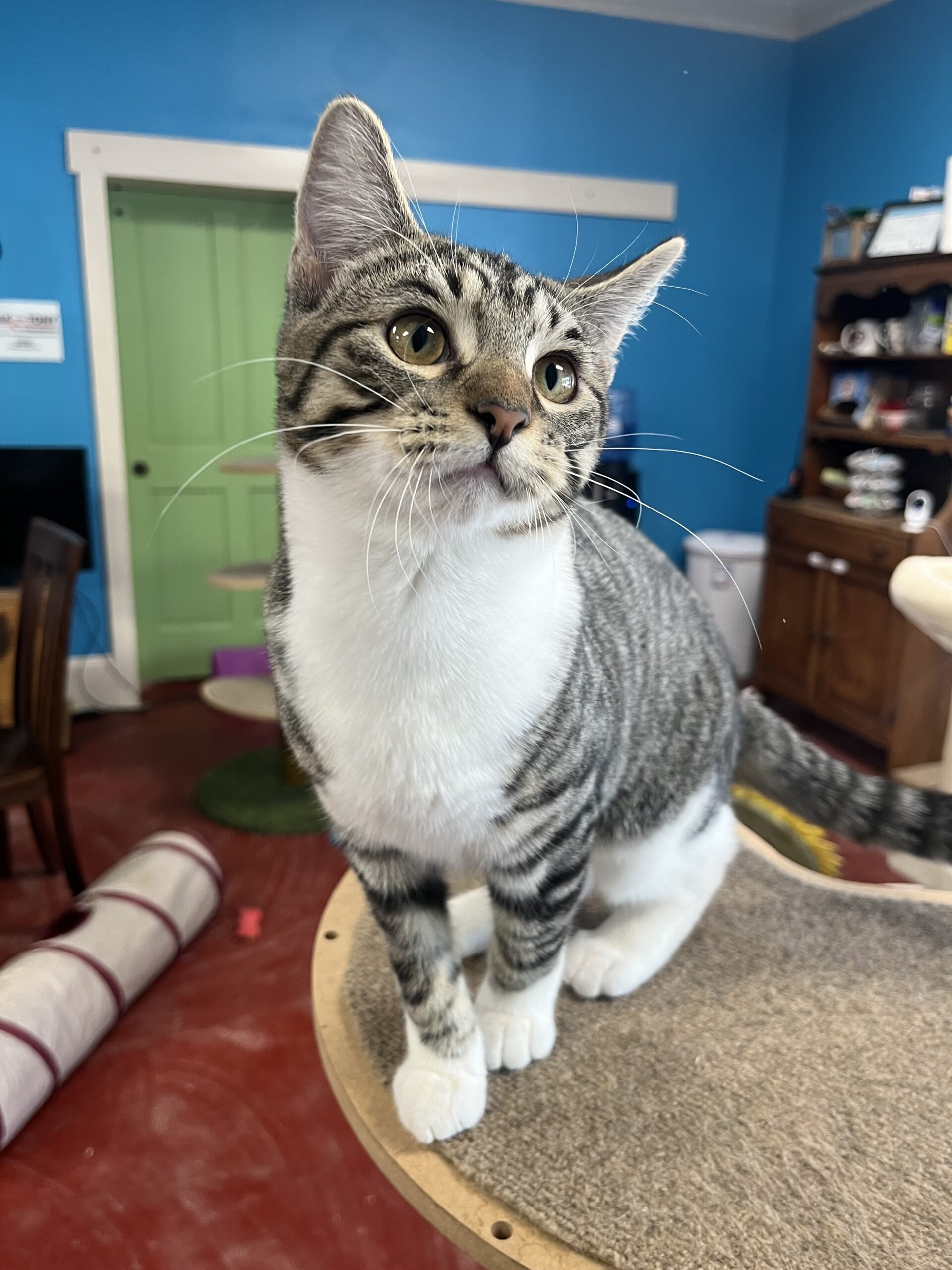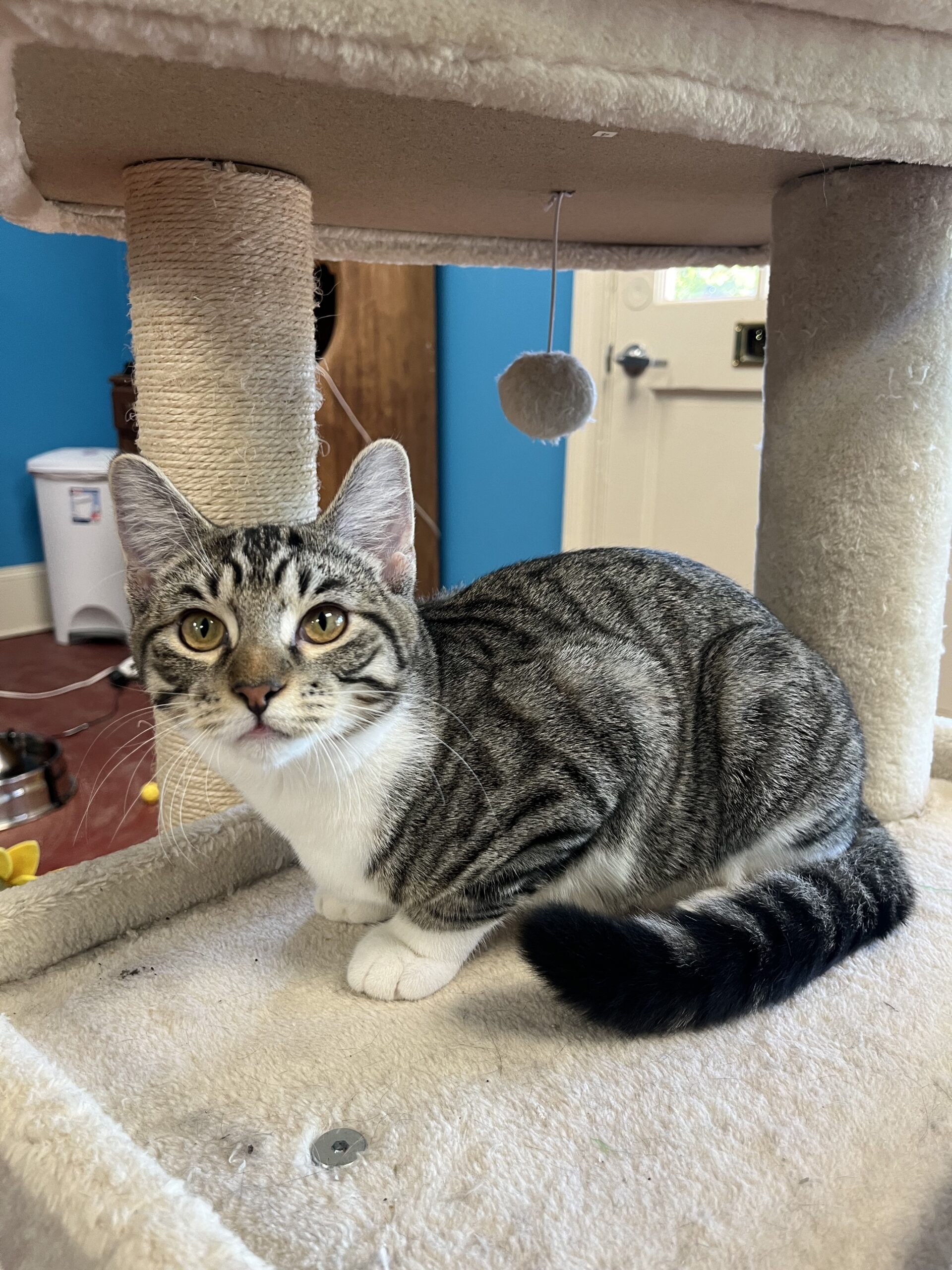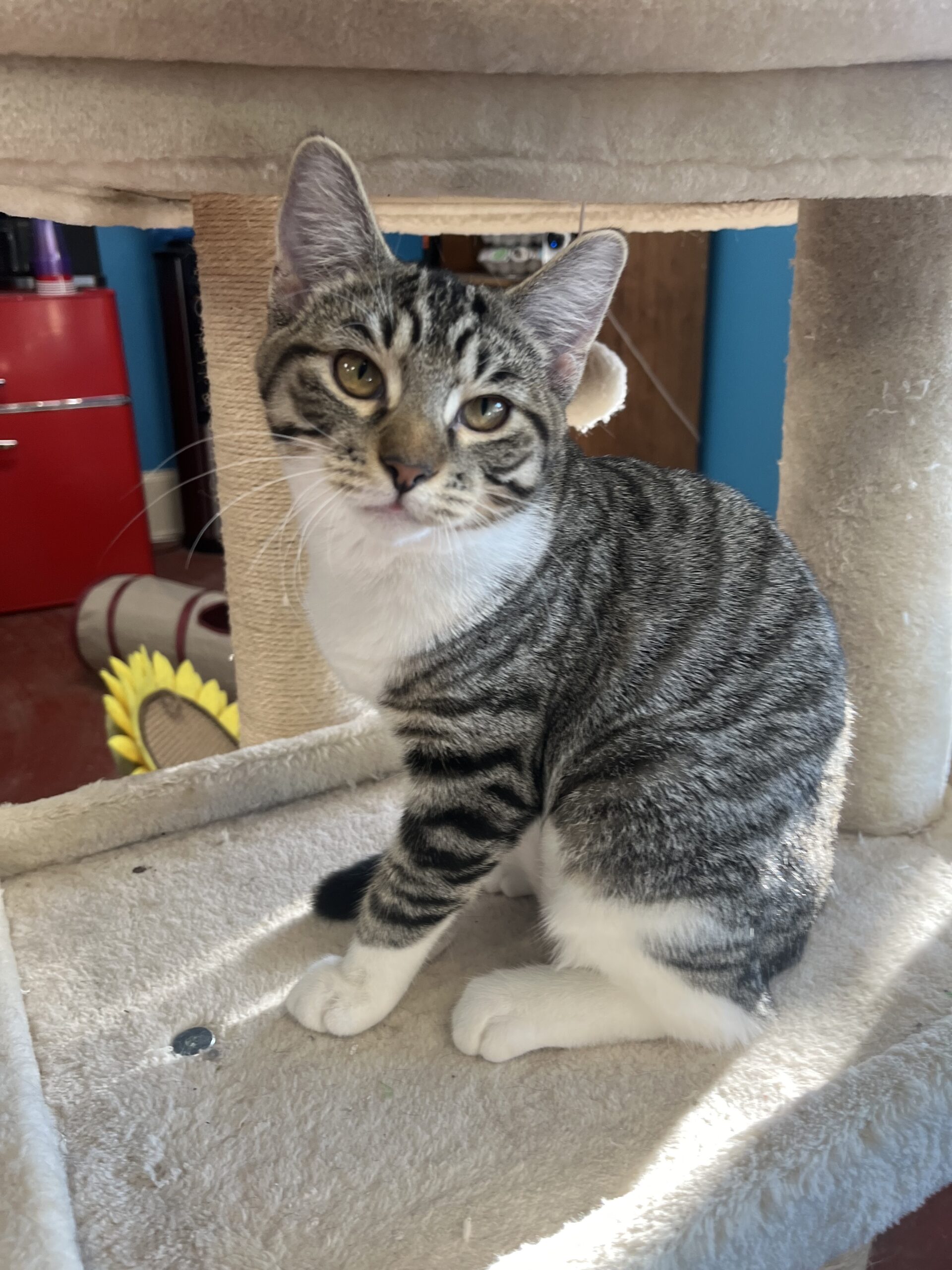 Darla is the chill one out of the little rascal pair. She eats and plays and then powers down for a long nap. She also loves to climb and be the queen of the cat tower! But of course she can’t do anything without her brother Spanky! The little dynamic duo are never seen apart and would love to share the space on your lap. Cuddles and purrs are what they’re all about.