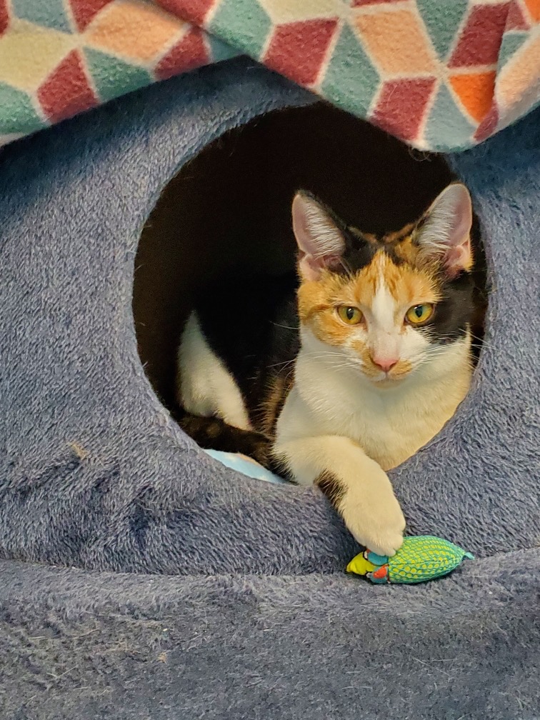 Sushi Roll was captured during a local TNR effort, but was quickly found to be friendly and not feral! Almost immediately she began cuddling up with AARF staff and begging for cuddles! This playful and sweet girl is looking for a home with her sister, Sashimi, as they are a bonded pair!